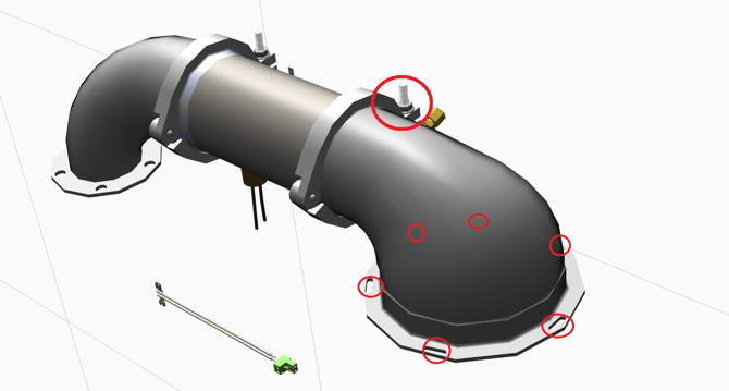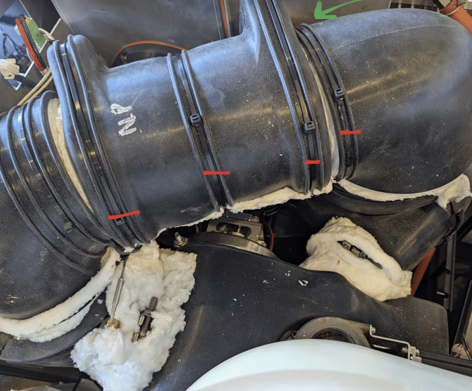 13. Cut the zip ties holding the silicone sleeve for the insulation for the heater and the transitional duct to the right of the heater. Note: Cut a slit in the silicone sleeve from the edge to the hole the thermocouple protrudes through (green arrow points in direction of the probe). Remove silicone sleeves.